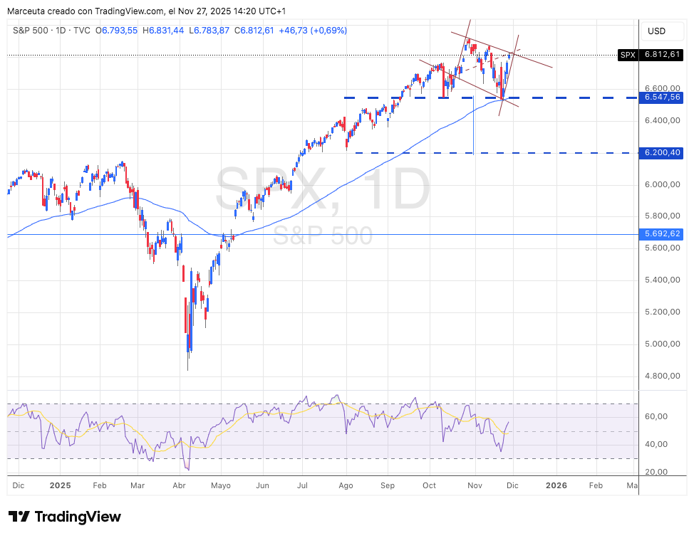- Una ruptura al alza por encima de la zona de 6.860/6.870 invalidaría la figura, sugiriendo que la tendencia alcista podría continuar sin mayor corrección.