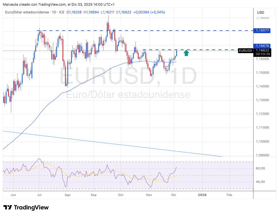 Desde el punto de vista técnico, el par está muy cerca de superar la zona de 1.1670, nivel clave cuya ruptura confirmaría la activación de un patrón de doble suelo, con un objetivo teórico en 1.1800.