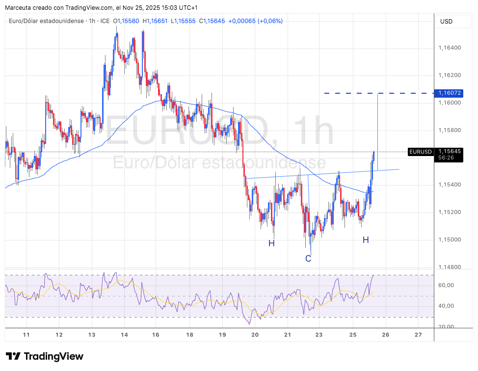 Desde el punto de vista técnico, el EURUSD en gráfico de 1 hora está rompiendo el neckline de un hombro-cabeza-hombro invertido, cuya proyección teórica apunta hacia la zona de 1,1600 en el corto plazo. Si las expectativas de un acuerdo de paz se consolidan, el par podría incluso superar el área de 1,1650.