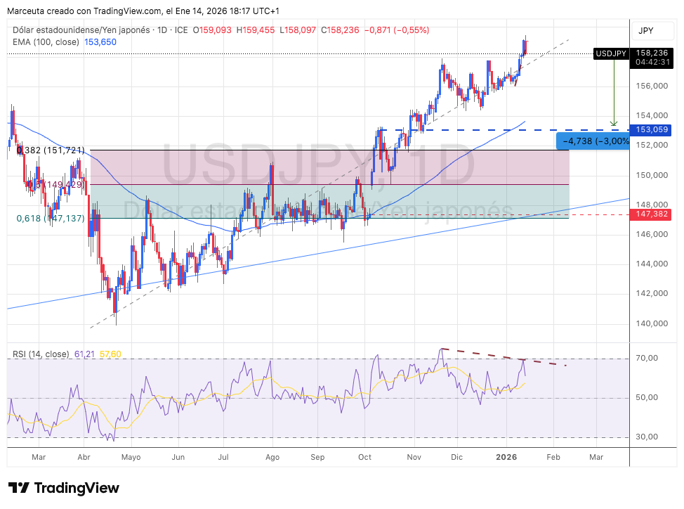 Desde el punto de vista técnico, el movimiento alcista del USDJPY muestra señales de agotamiento. En el gráfico diario se observa una clara divergencia bajista, lo que sugiere un posible escenario de corrección.