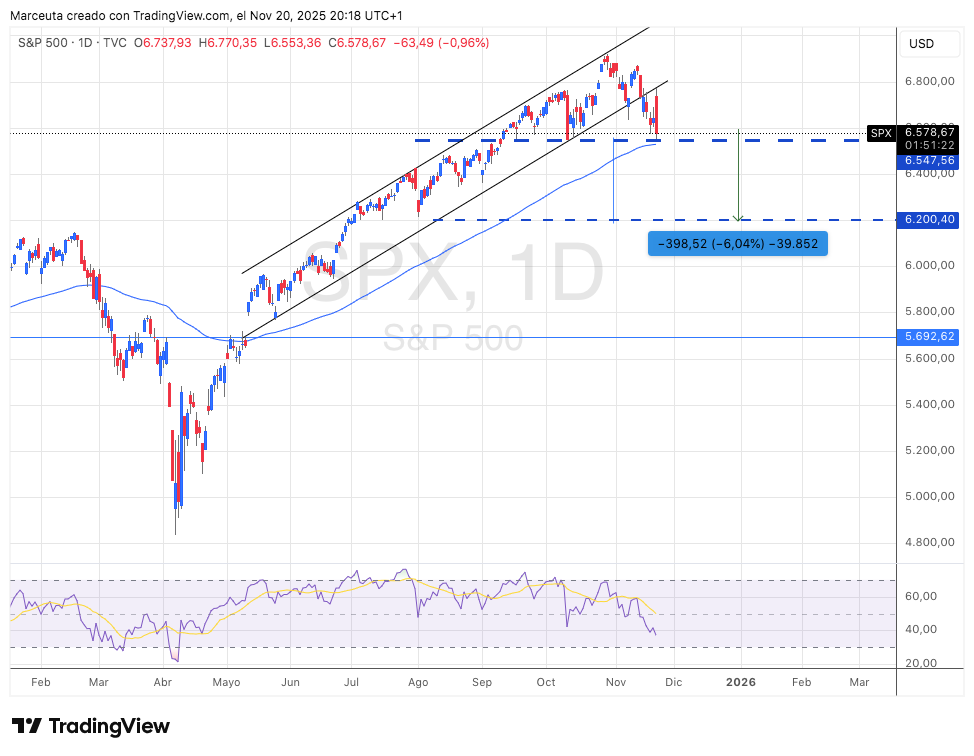 Desde el punto de vista técnico, el S&P 500 se encuentra muy próximo a una zona de soporte clave en los 6.550 puntos. Una ruptura clara por debajo de este nivel activaría un objetivo teórico en torno a los 6.200 puntos, lo que implicaría una caída adicional cercana al 6% desde los niveles actuales.