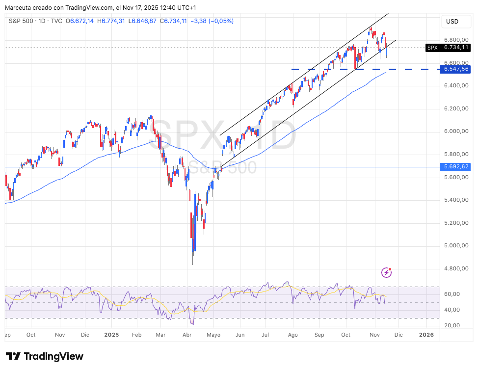 En el plano técnico, el S&P 500 ha perforado a la baja el canal alcista que ha guiado la tendencia desde mayo. Si la cotización se mantiene por debajo de este rango, se abriría la puerta a un movimiento correctivo hacia al menos la zona de los 6.550 puntos, lo que implicaría un retroceso cercano al 3% desde los niveles actuales.